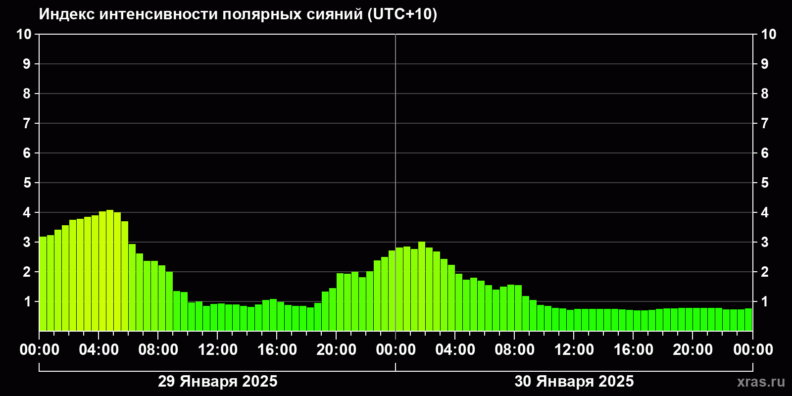 Изменения индекса интенсивности полярных сияний с 2025-01-29 по 2025-01-30 по местному времени