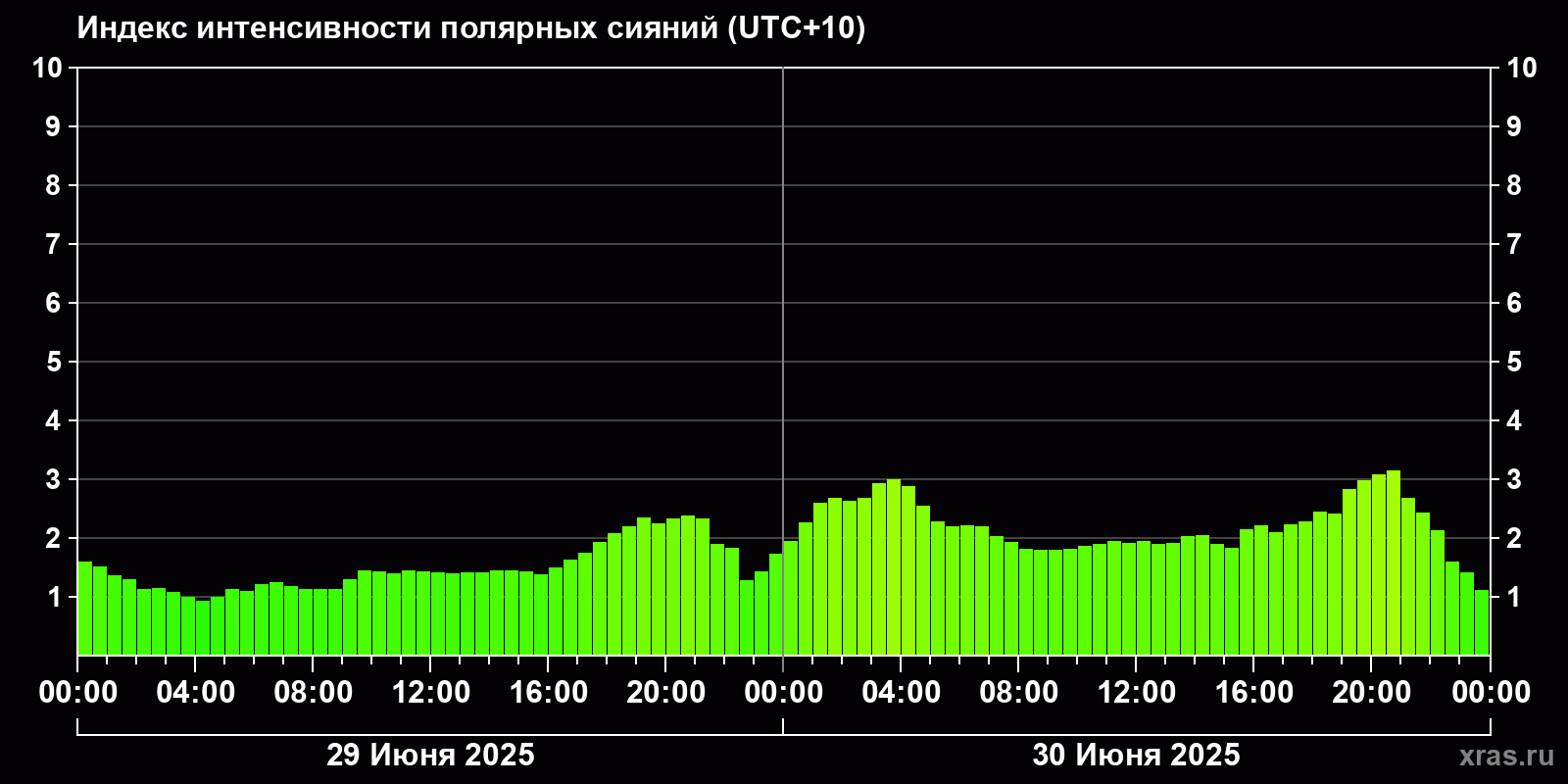 Изменения индекса интенсивности полярных сияний с 2025-06-29 по 2025-06-30 по местному времени