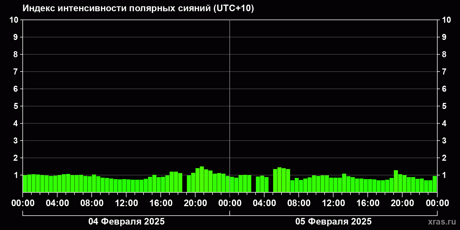 Изменения индекса интенсивности полярных сияний с 2025-02-04 по 2025-02-05 по местному времени