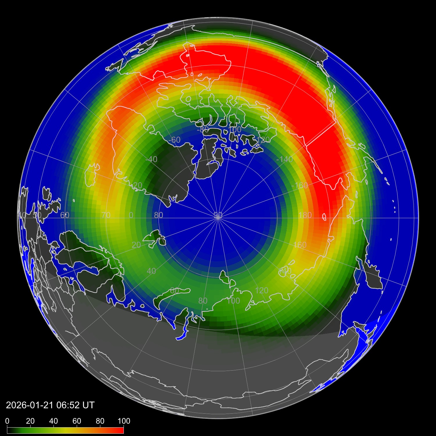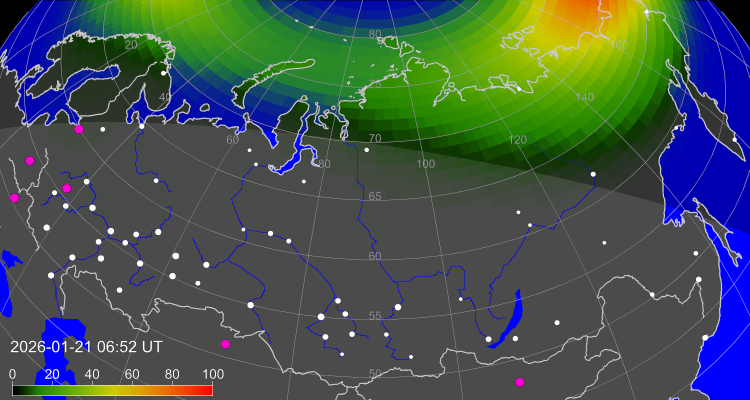 Изменения и часовой прогноз индекса интенсивности полярных сияний с 2026-01-20 по 2026-01-21