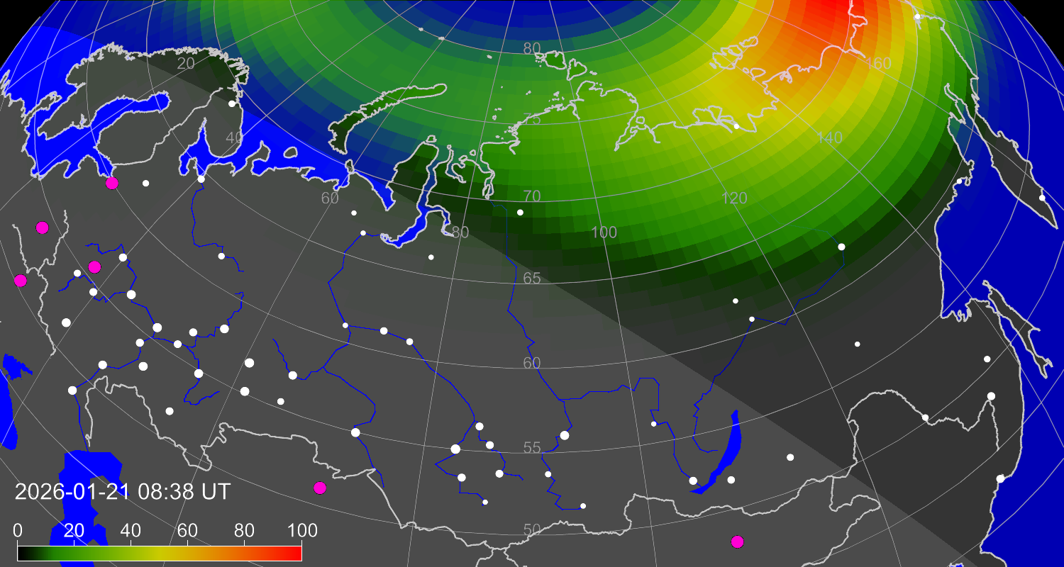 Индекс интенсивности полярных сияний и теоретически возможная широта наблюдений для ночного времени в восточном полушарии