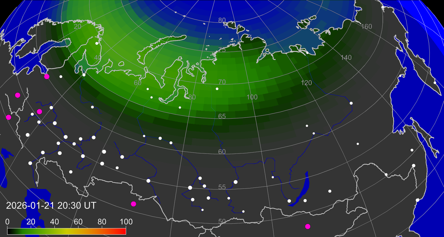 Изменения и часовой прогноз индекса интенсивности полярных сияний с 2026-01-20 по 2026-01-21