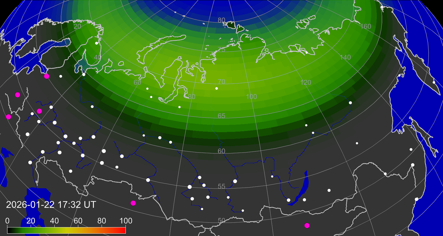 Индекс интенсивности полярных сияний и теоретически возможная широта наблюдений для ночного времени в восточном полушарии