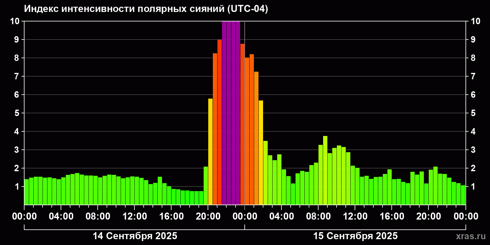 Изменения индекса интенсивности полярных сияний с 2025-09-14 по 2025-09-15 по местному времени