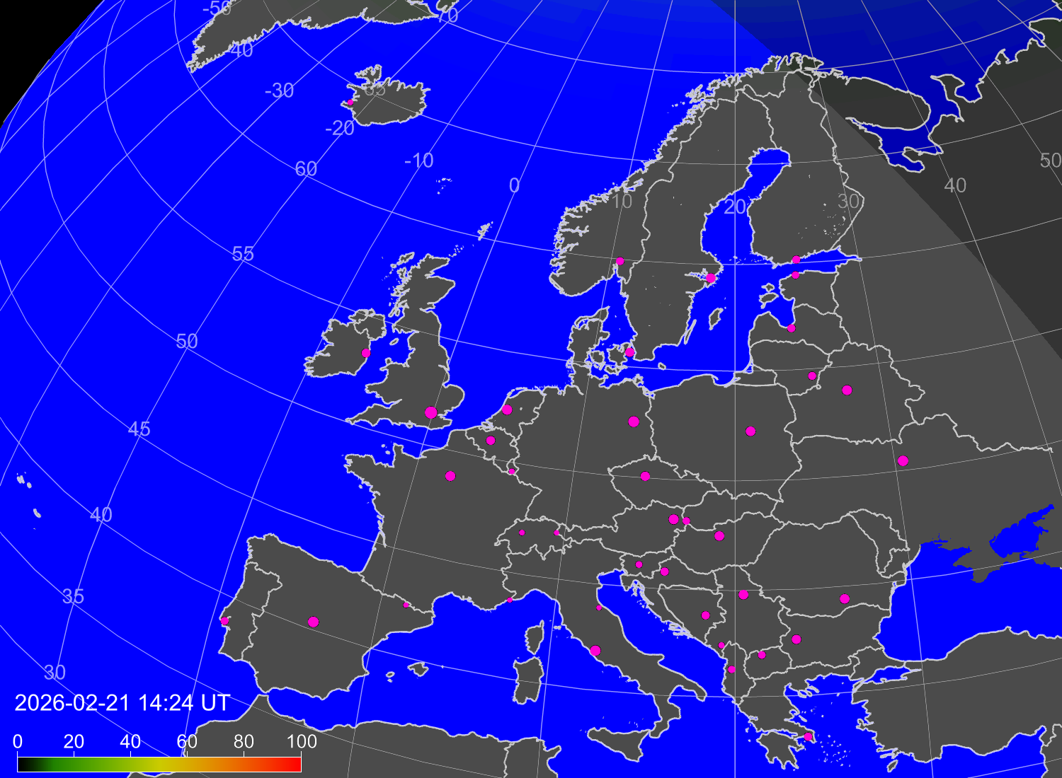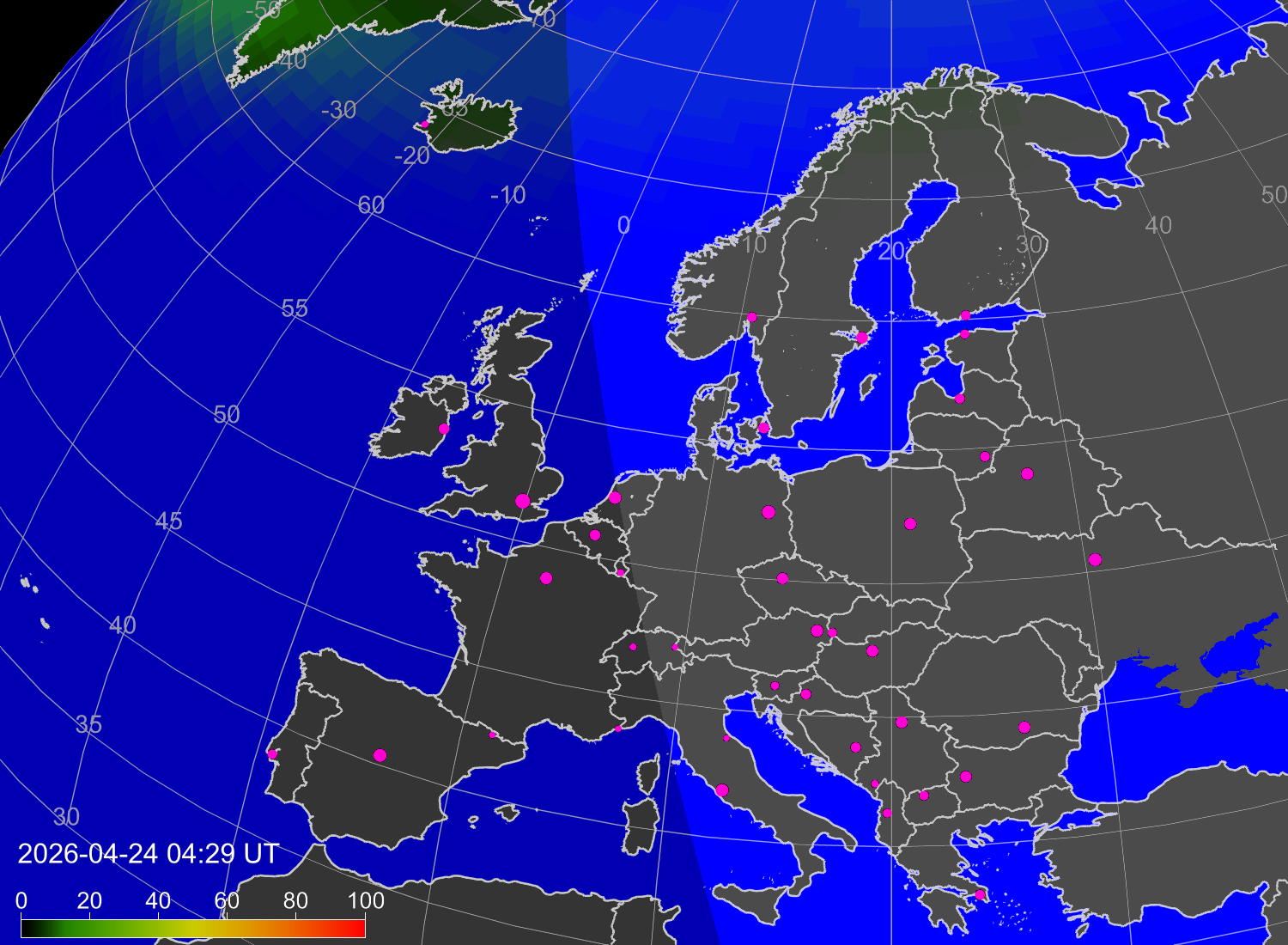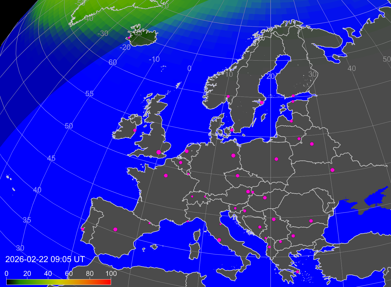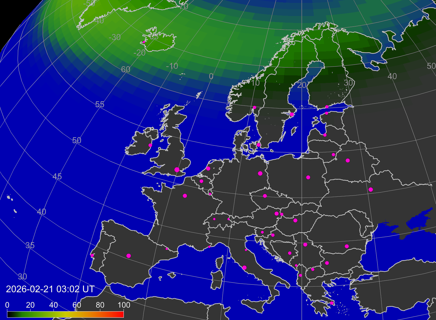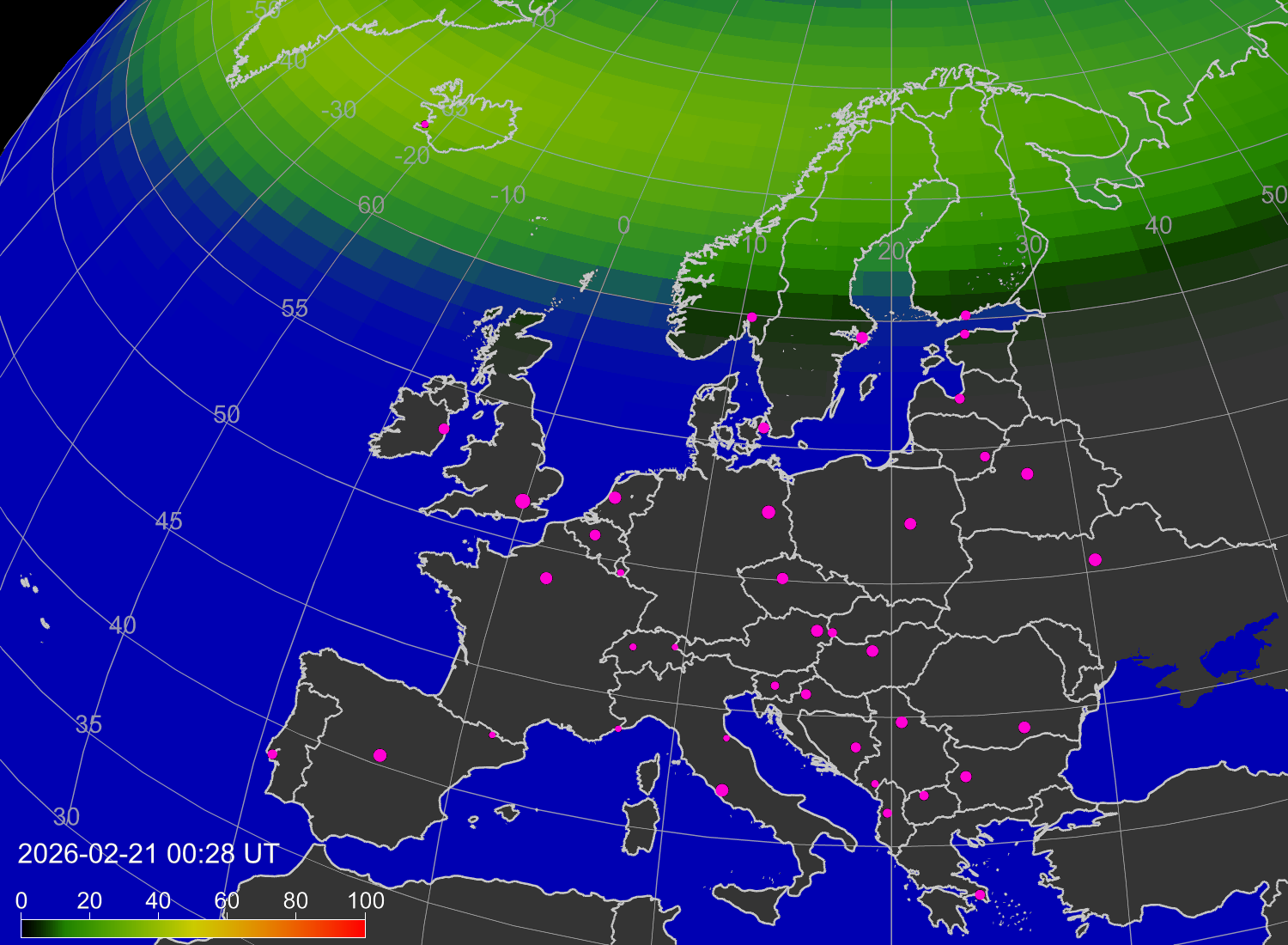 Индекс интенсивности полярных сияний и теоретически возможная широта наблюдений для ночного времени в восточном полушарии