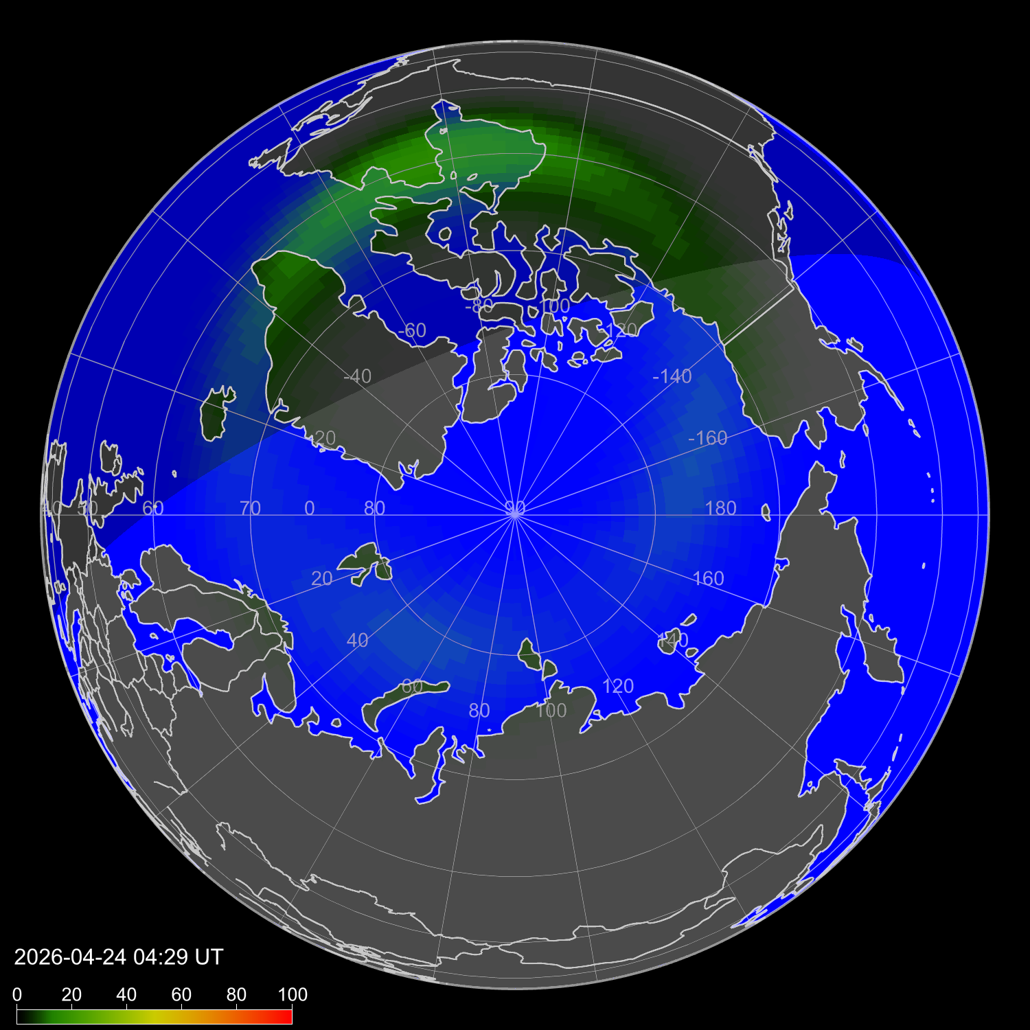 Изменения и часовой прогноз индекса интенсивности полярных сияний с 2026-04-23 по 2026-04-24