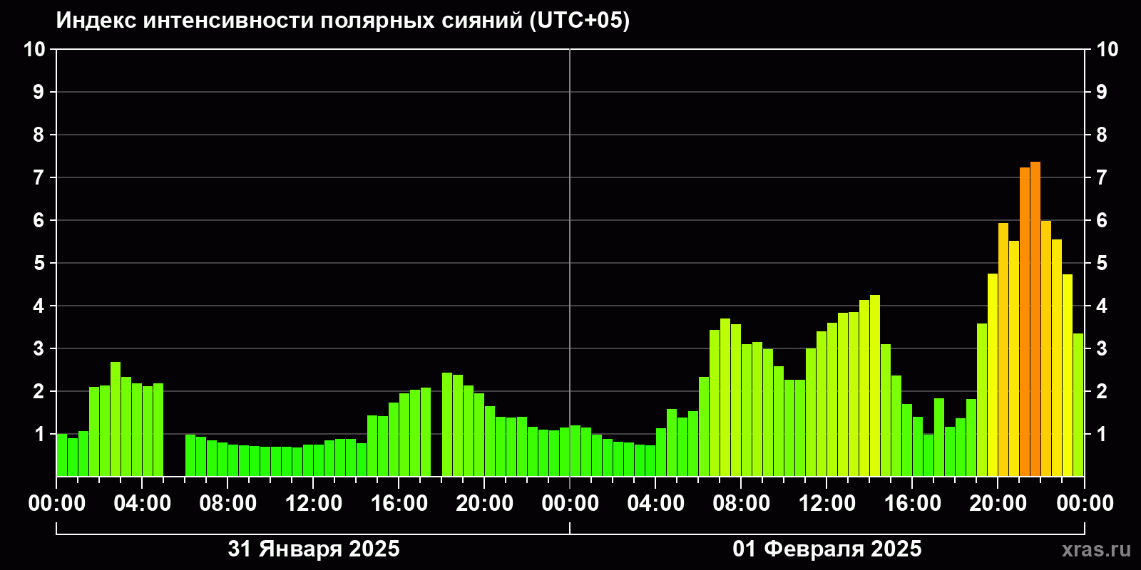 Изменения индекса интенсивности полярных сияний с 2025-01-31 по 2025-02-01 по местному времени