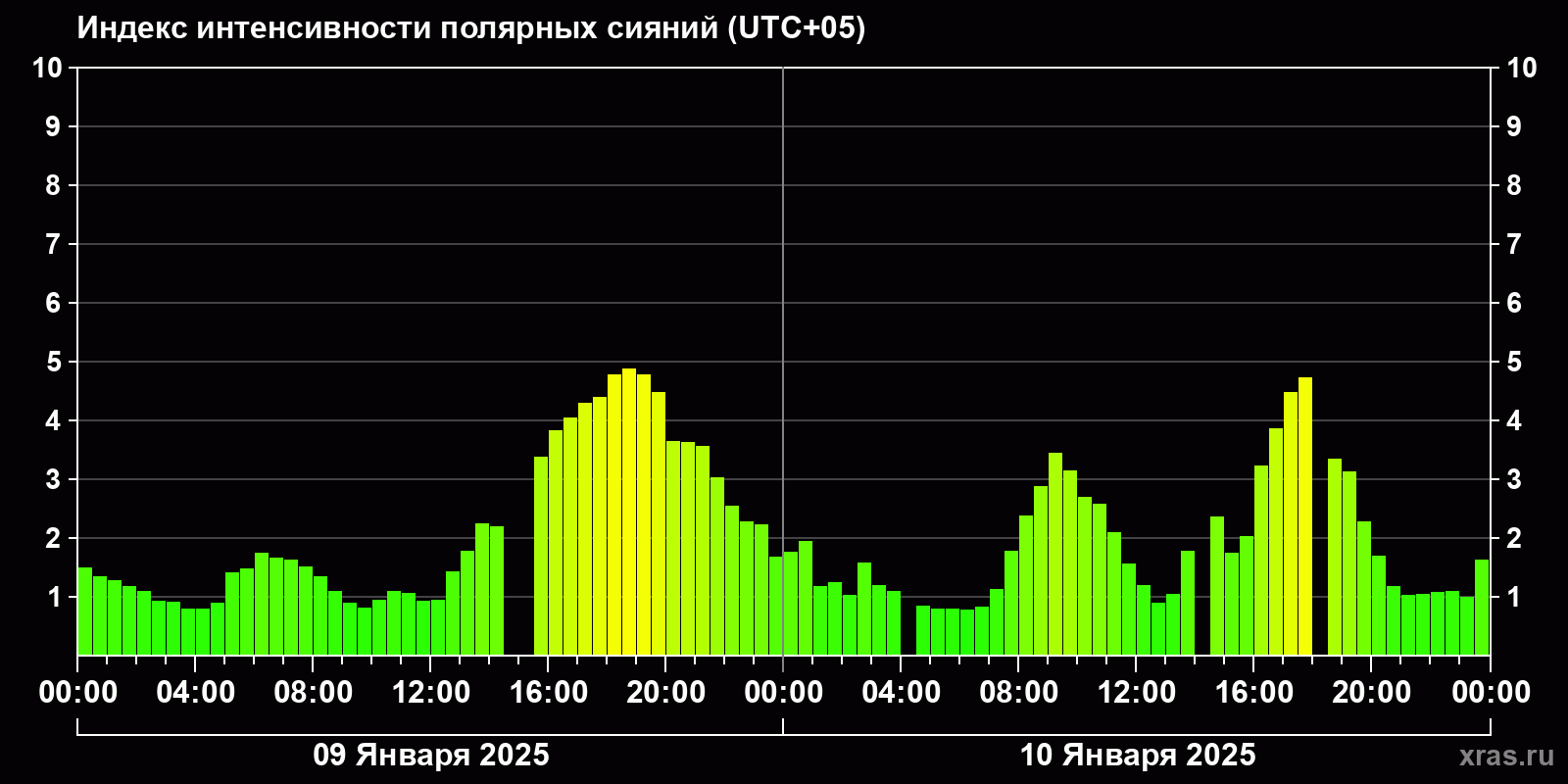 Изменения индекса интенсивности полярных сияний с 2025-01-09 по 2025-01-10 по местному времени