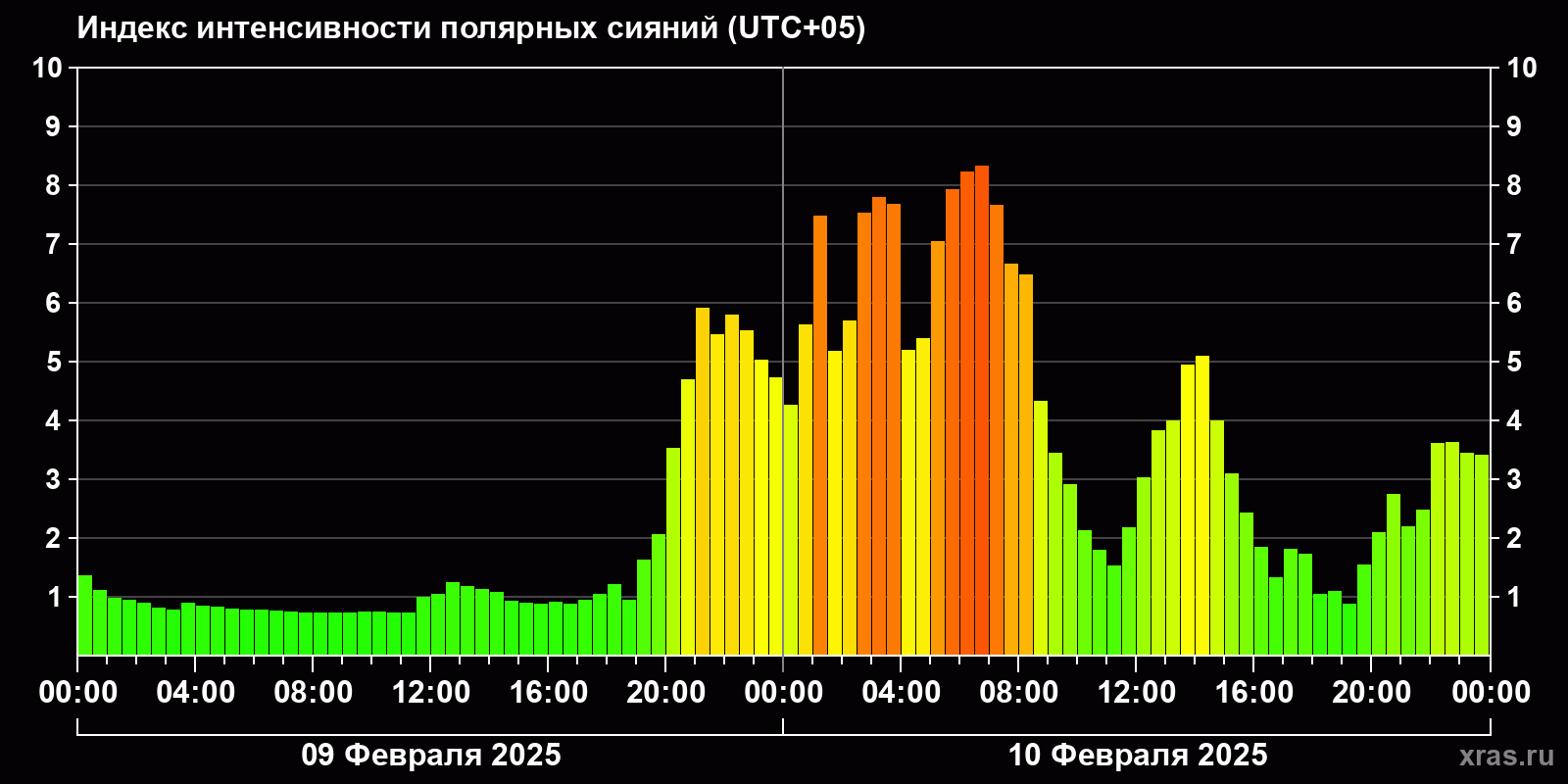 Изменения индекса интенсивности полярных сияний с 2025-02-09 по 2025-02-10 по местному времени