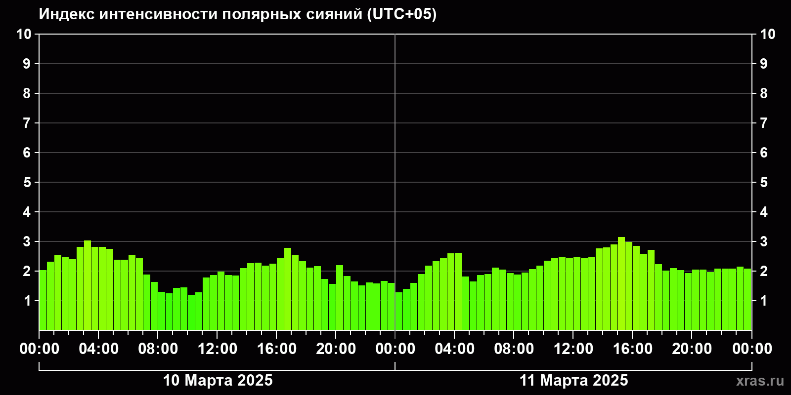 Изменения индекса интенсивности полярных сияний с 2025-03-10 по 2025-03-11 по местному времени
