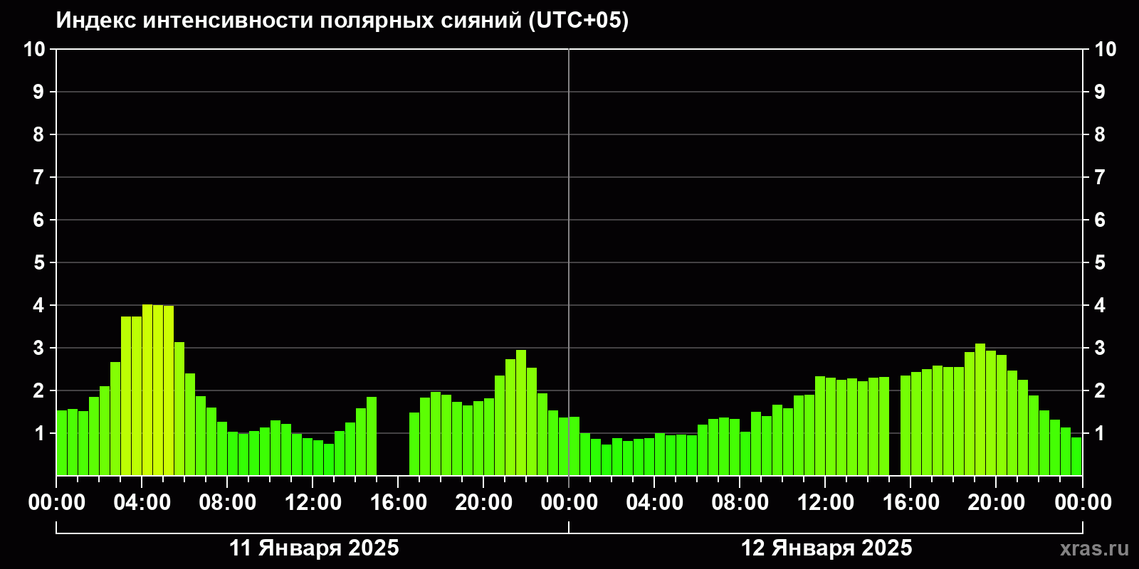 Изменения индекса интенсивности полярных сияний с 2025-01-11 по 2025-01-12 по местному времени