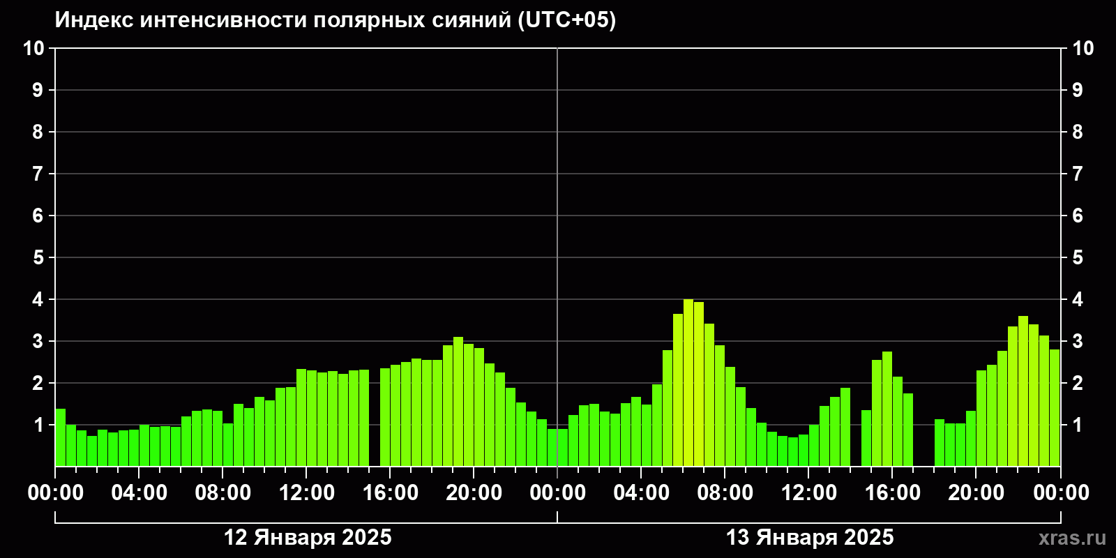 Изменения индекса интенсивности полярных сияний с 2025-01-12 по 2025-01-13 по местному времени