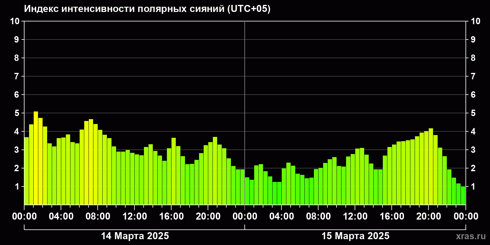 Изменения индекса интенсивности полярных сияний с 2025-03-14 по 2025-03-15 по местному времени
