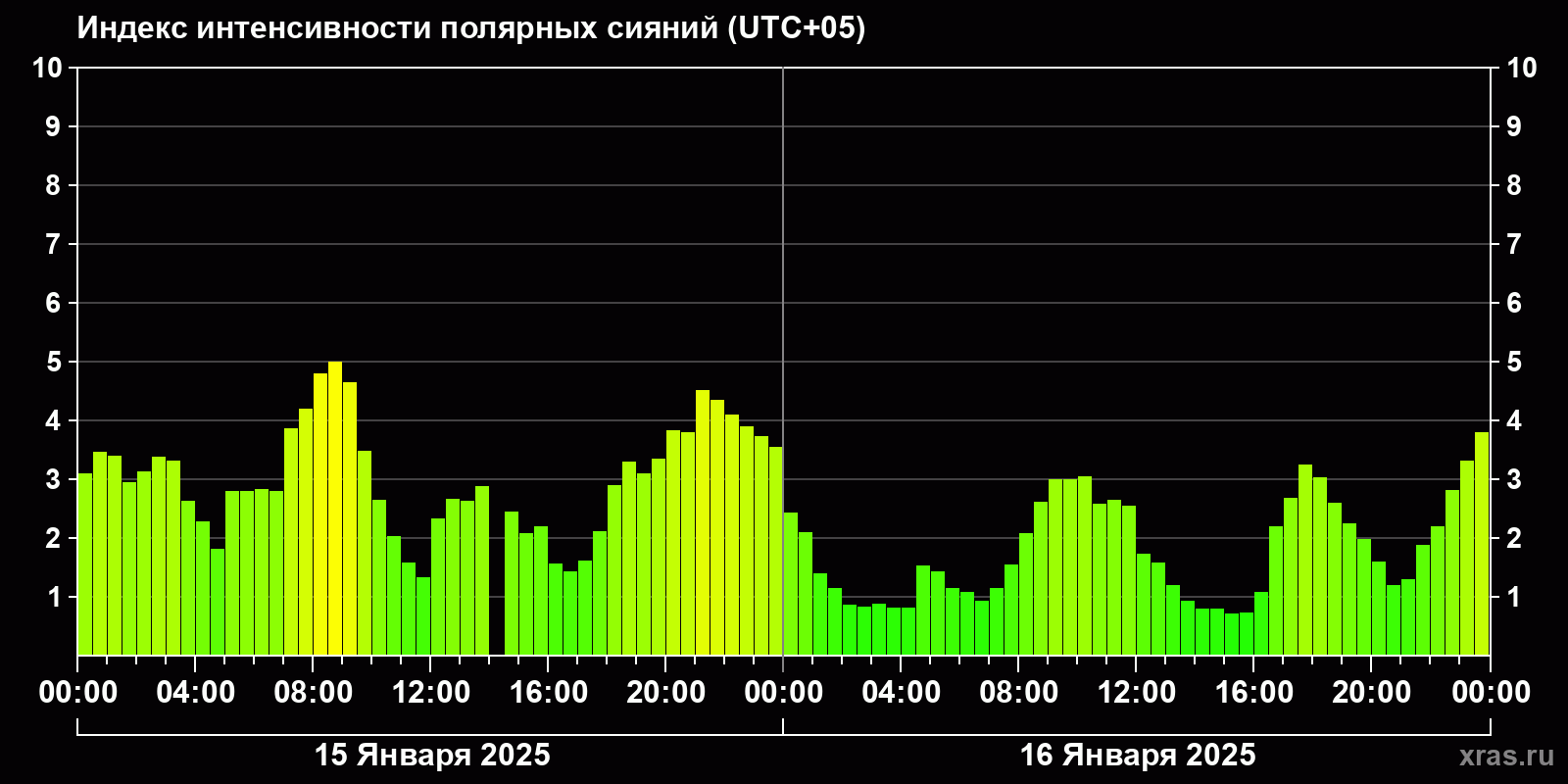 Изменения индекса интенсивности полярных сияний с 2025-01-15 по 2025-01-16 по местному времени