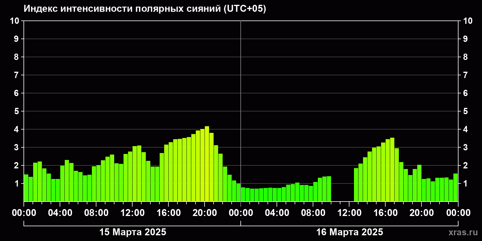 Изменения индекса интенсивности полярных сияний с 2025-03-15 по 2025-03-16 по местному времени