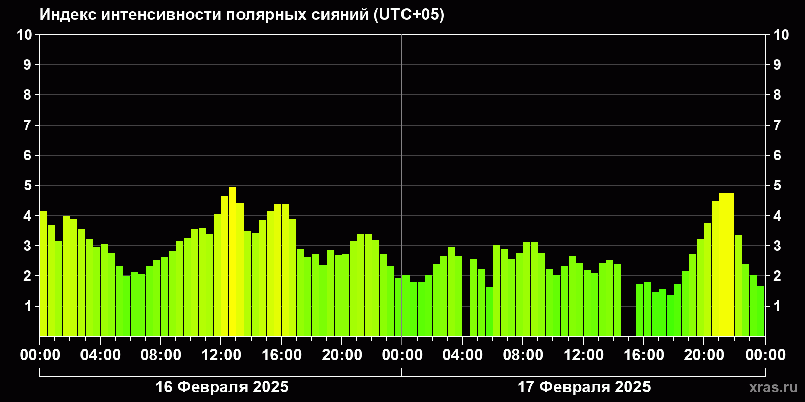 Изменения индекса интенсивности полярных сияний с 2025-02-16 по 2025-02-17 по местному времени