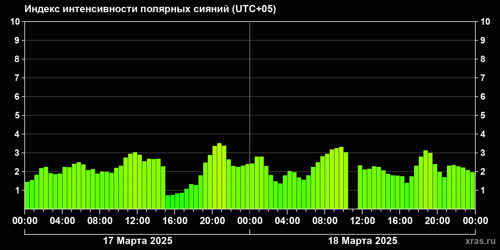 Изменения индекса интенсивности полярных сияний с 2025-03-17 по 2025-03-18 по местному времени