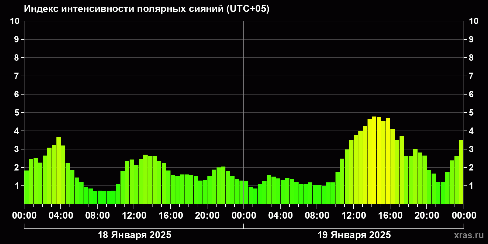 Изменения индекса интенсивности полярных сияний с 2025-01-18 по 2025-01-19 по местному времени