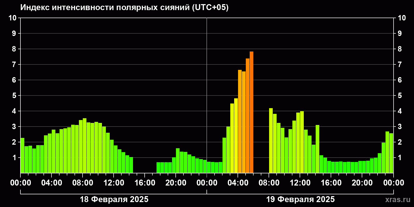 Изменения индекса интенсивности полярных сияний с 2025-02-18 по 2025-02-19 по местному времени