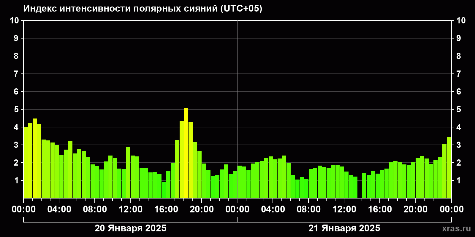 Изменения индекса интенсивности полярных сияний с 2025-01-20 по 2025-01-21 по местному времени