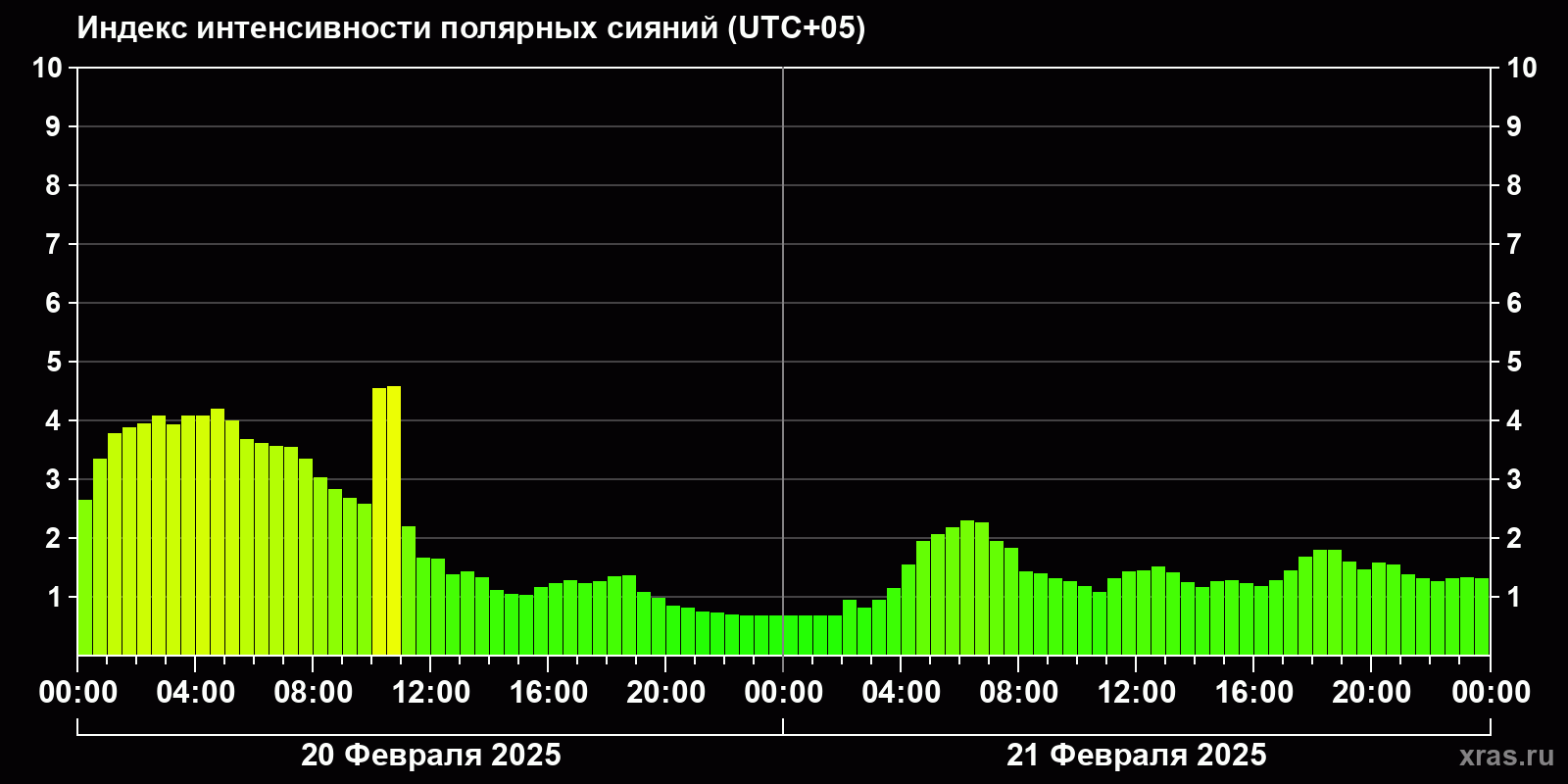 Изменения индекса интенсивности полярных сияний с 2025-02-20 по 2025-02-21 по местному времени