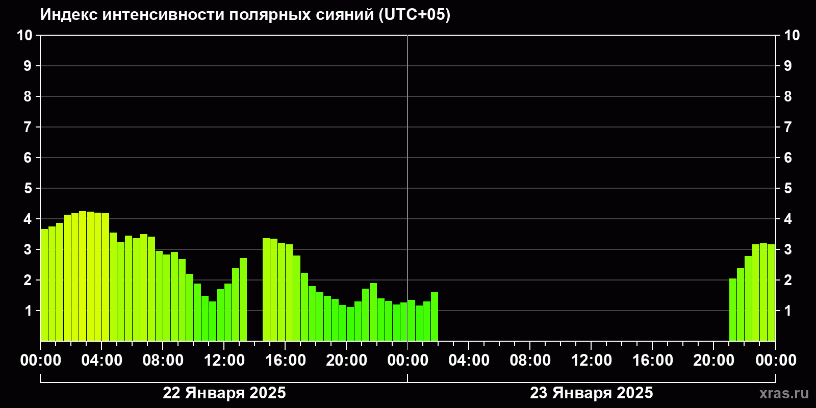 Изменения индекса интенсивности полярных сияний с 2025-01-22 по 2025-01-23 по местному времени