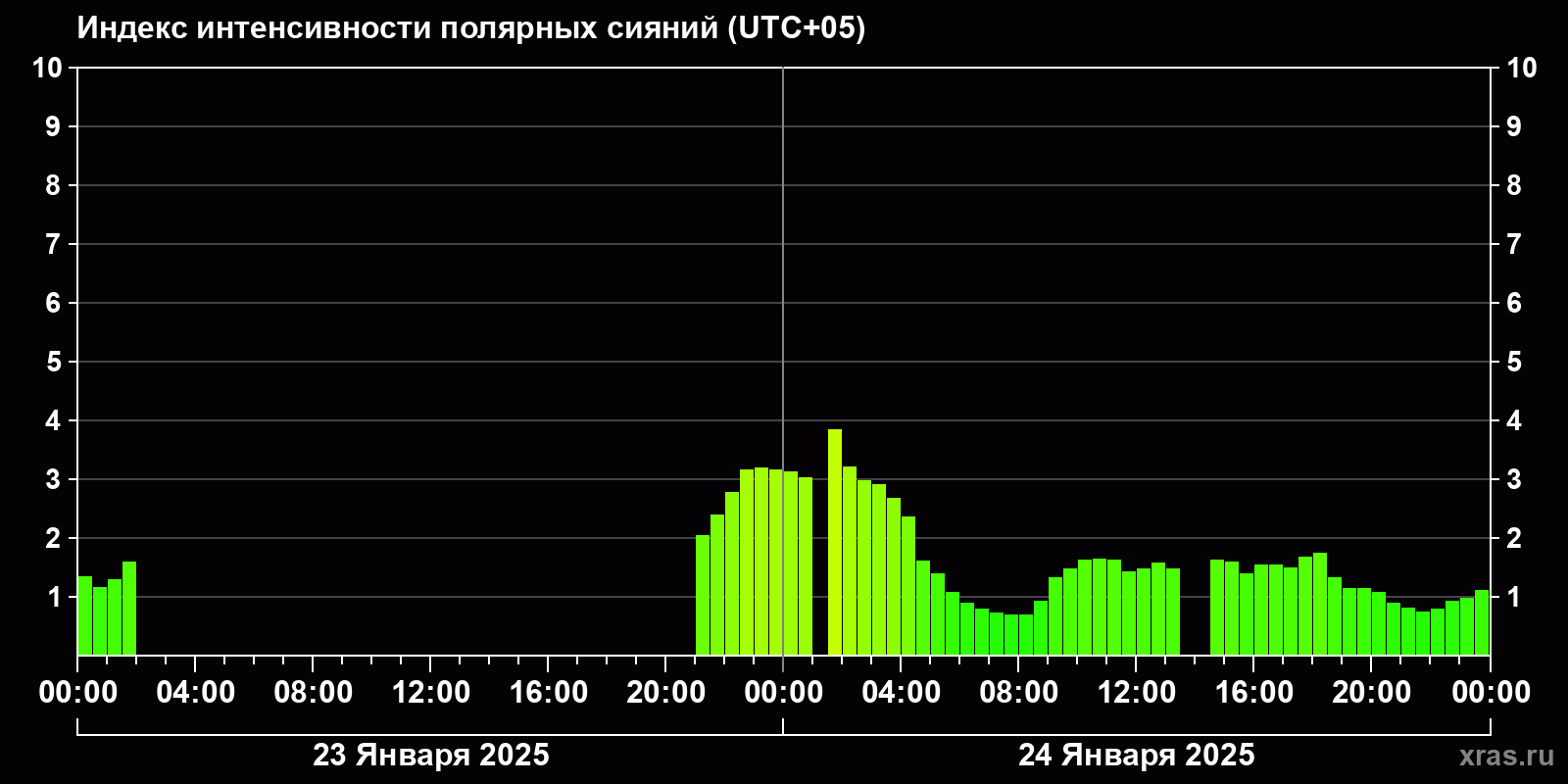 Изменения индекса интенсивности полярных сияний с 2025-01-23 по 2025-01-24 по местному времени