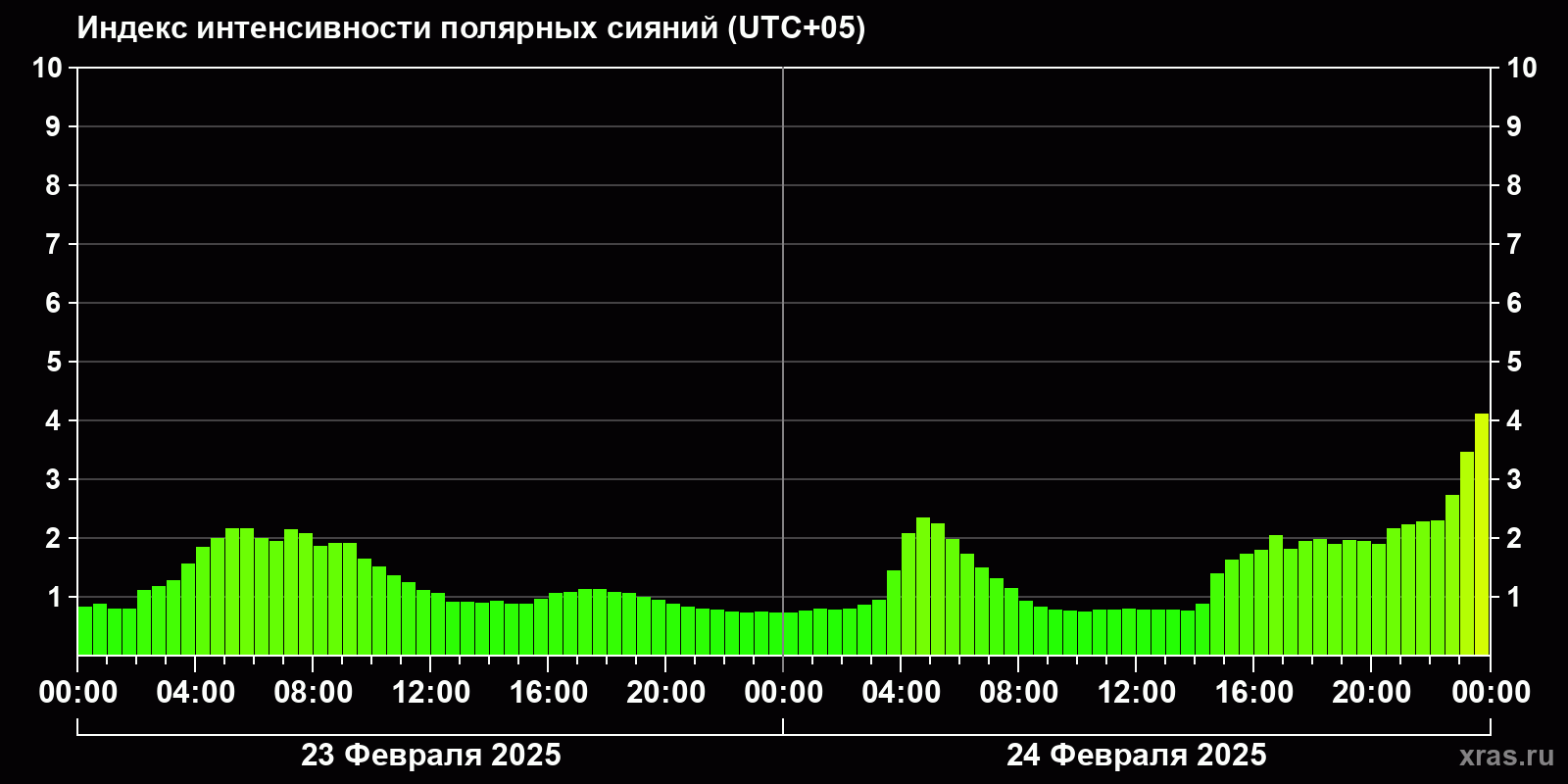 Изменения индекса интенсивности полярных сияний с 2025-02-23 по 2025-02-24 по местному времени