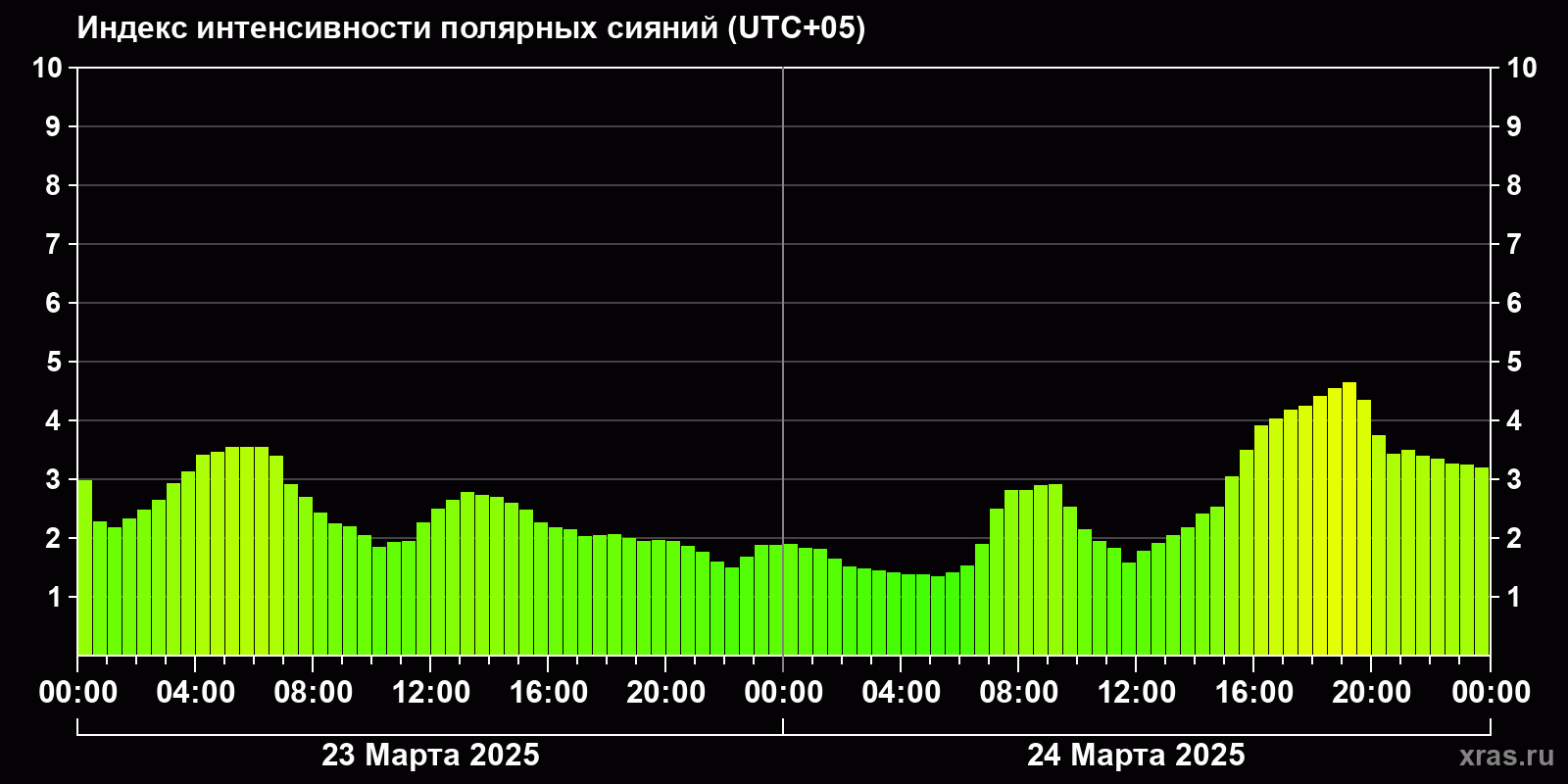 Изменения индекса интенсивности полярных сияний с 2025-03-23 по 2025-03-24 по местному времени