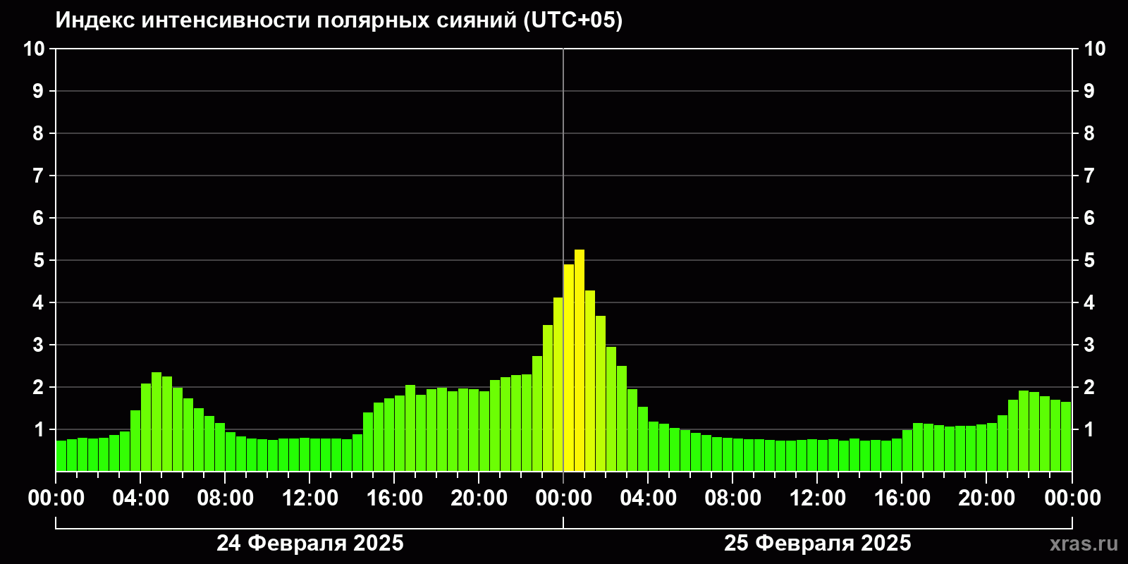 Изменения индекса интенсивности полярных сияний с 2025-02-24 по 2025-02-25 по местному времени