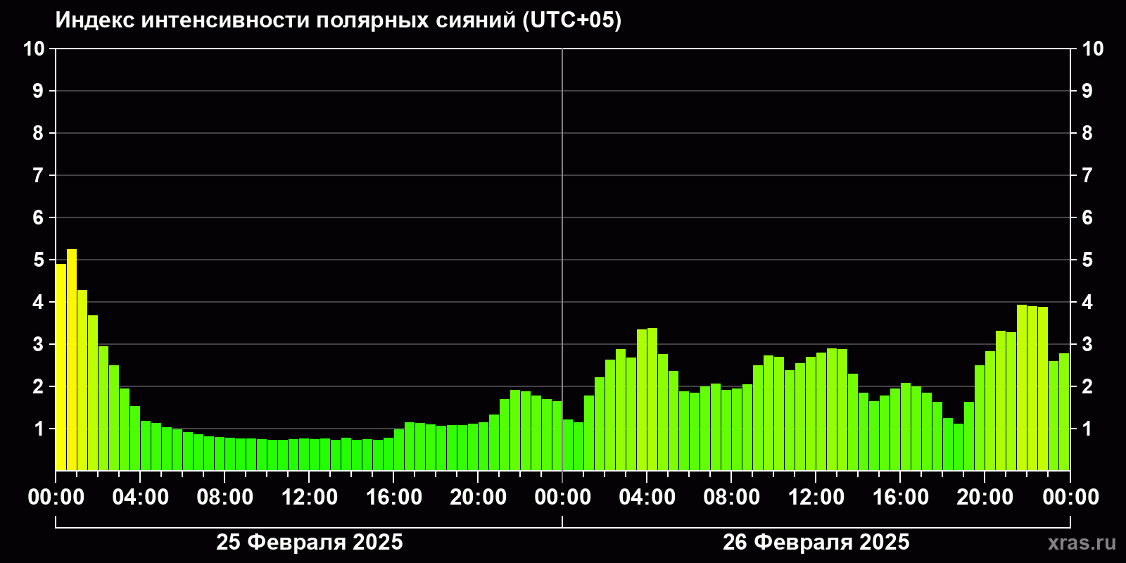 Изменения индекса интенсивности полярных сияний с 2025-02-25 по 2025-02-26 по местному времени