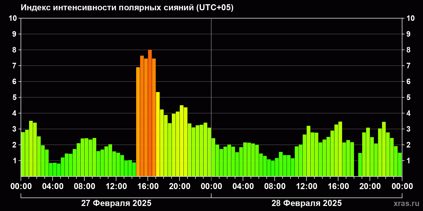 Изменения индекса интенсивности полярных сияний с 2025-02-27 по 2025-02-28 по местному времени