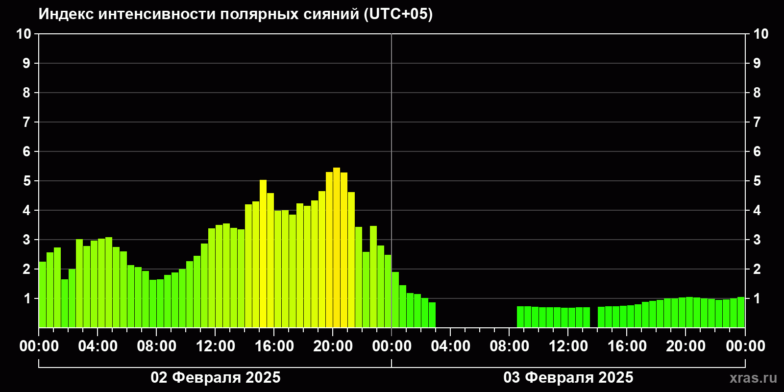 Изменения индекса интенсивности полярных сияний с 2025-02-02 по 2025-02-03 по местному времени