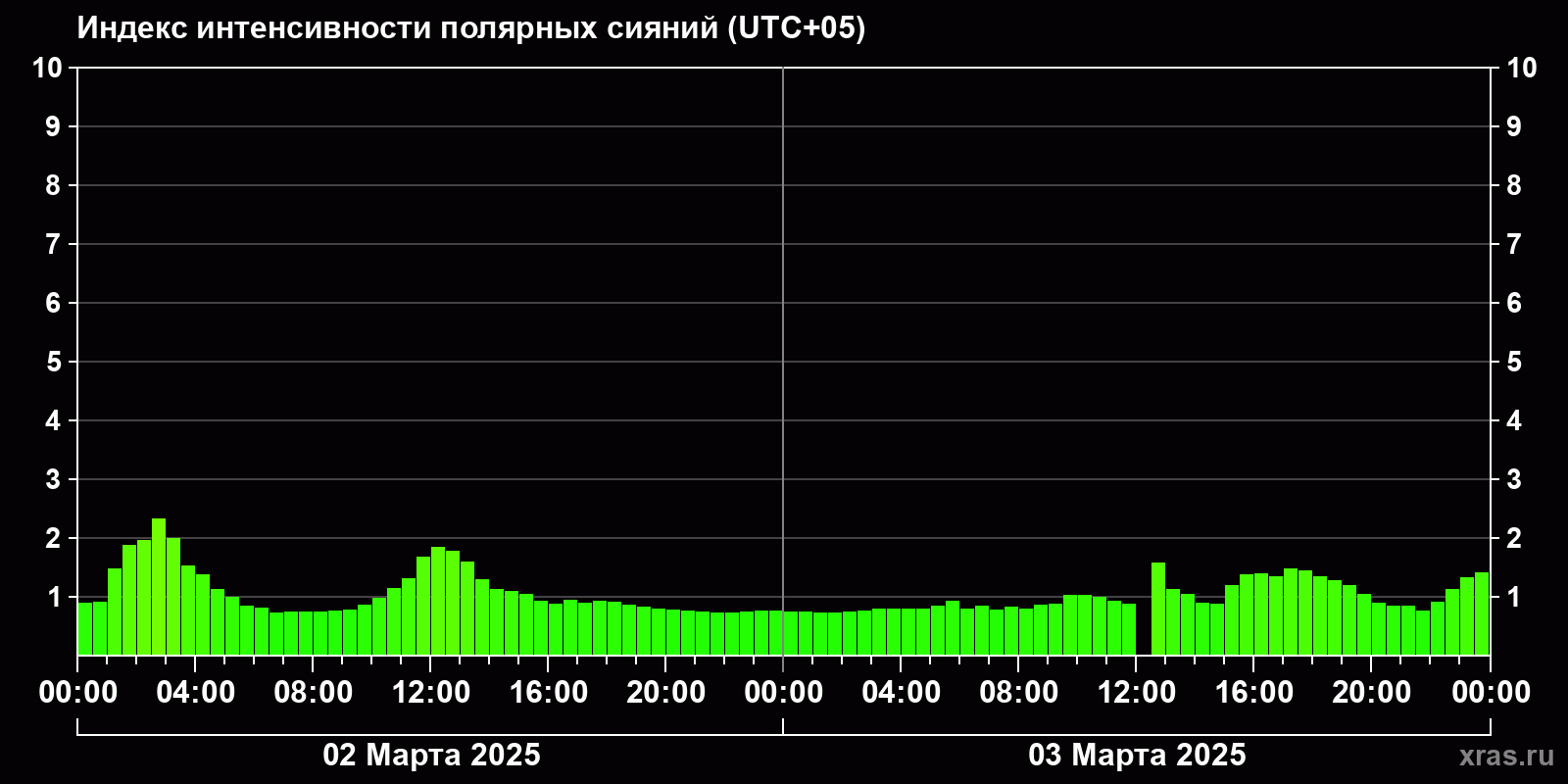 Изменения индекса интенсивности полярных сияний с 2025-03-02 по 2025-03-03 по местному времени