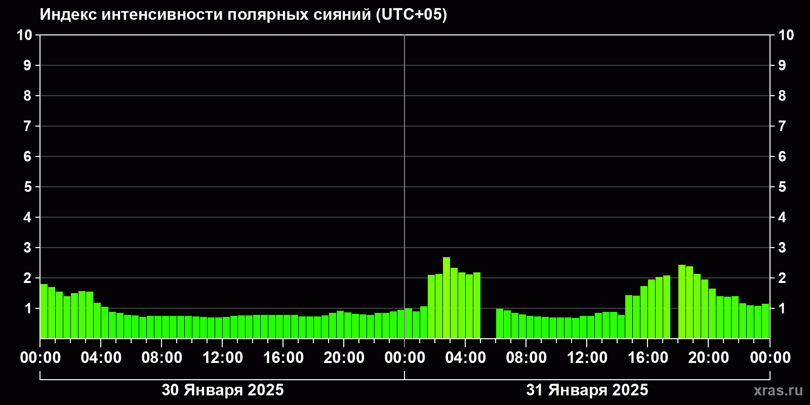 Изменения индекса интенсивности полярных сияний с 2025-01-30 по 2025-01-31 по местному времени