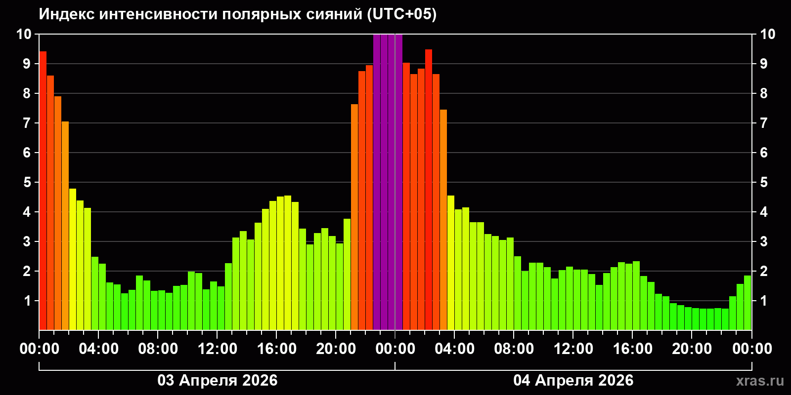 Изменения индекса интенсивности полярных сияний с 2026-04-03 по 2026-04-04 по местному времени