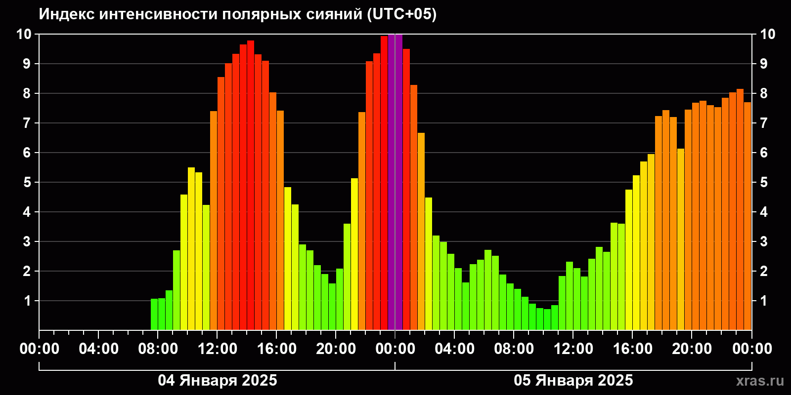 Изменения индекса интенсивности полярных сияний с 2025-01-04 по 2025-01-05 по местному времени