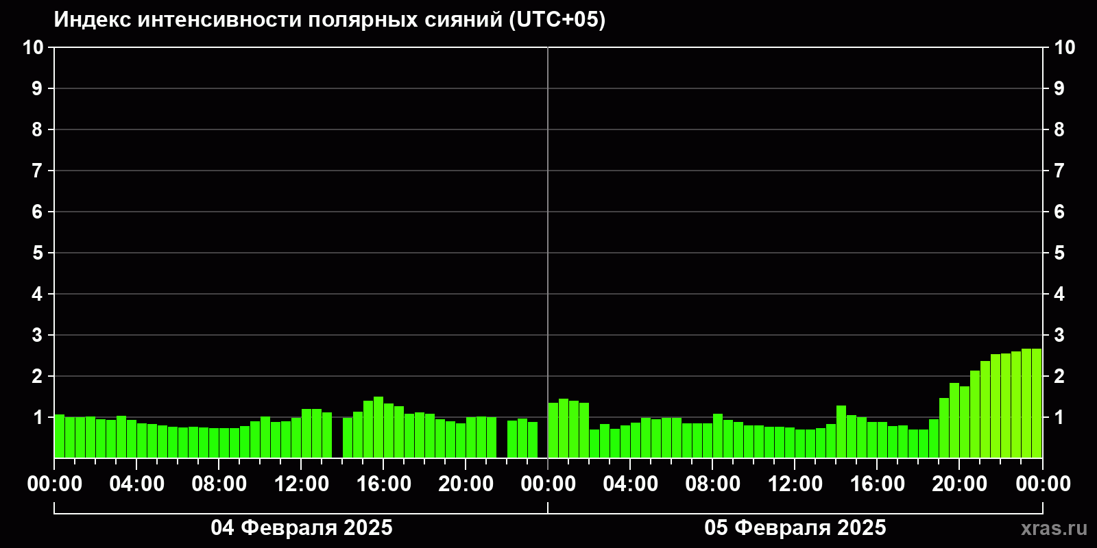 Изменения индекса интенсивности полярных сияний с 2025-02-04 по 2025-02-05 по местному времени