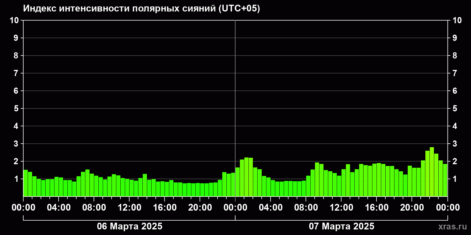 Изменения индекса интенсивности полярных сияний с 2025-03-06 по 2025-03-07 по местному времени