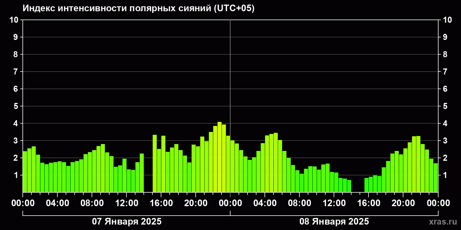 Изменения индекса интенсивности полярных сияний с 2025-01-07 по 2025-01-08 по местному времени