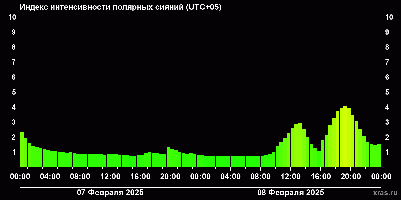 Изменения индекса интенсивности полярных сияний с 2025-02-07 по 2025-02-08 по местному времени