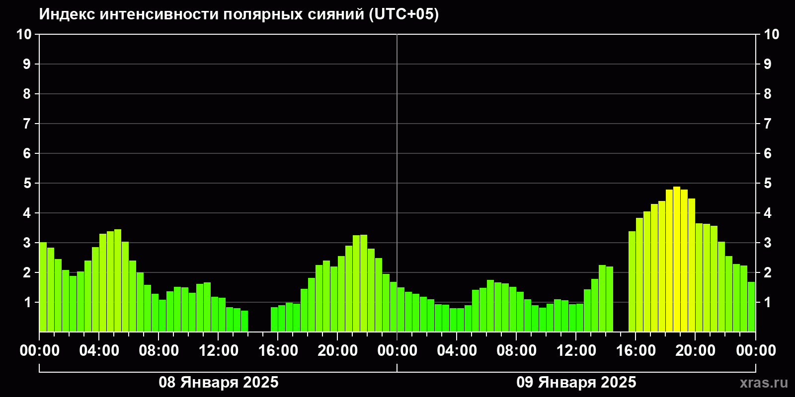 Изменения индекса интенсивности полярных сияний с 2025-01-08 по 2025-01-09 по местному времени