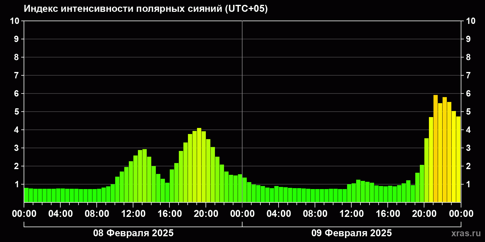 Изменения индекса интенсивности полярных сияний с 2025-02-08 по 2025-02-09 по местному времени