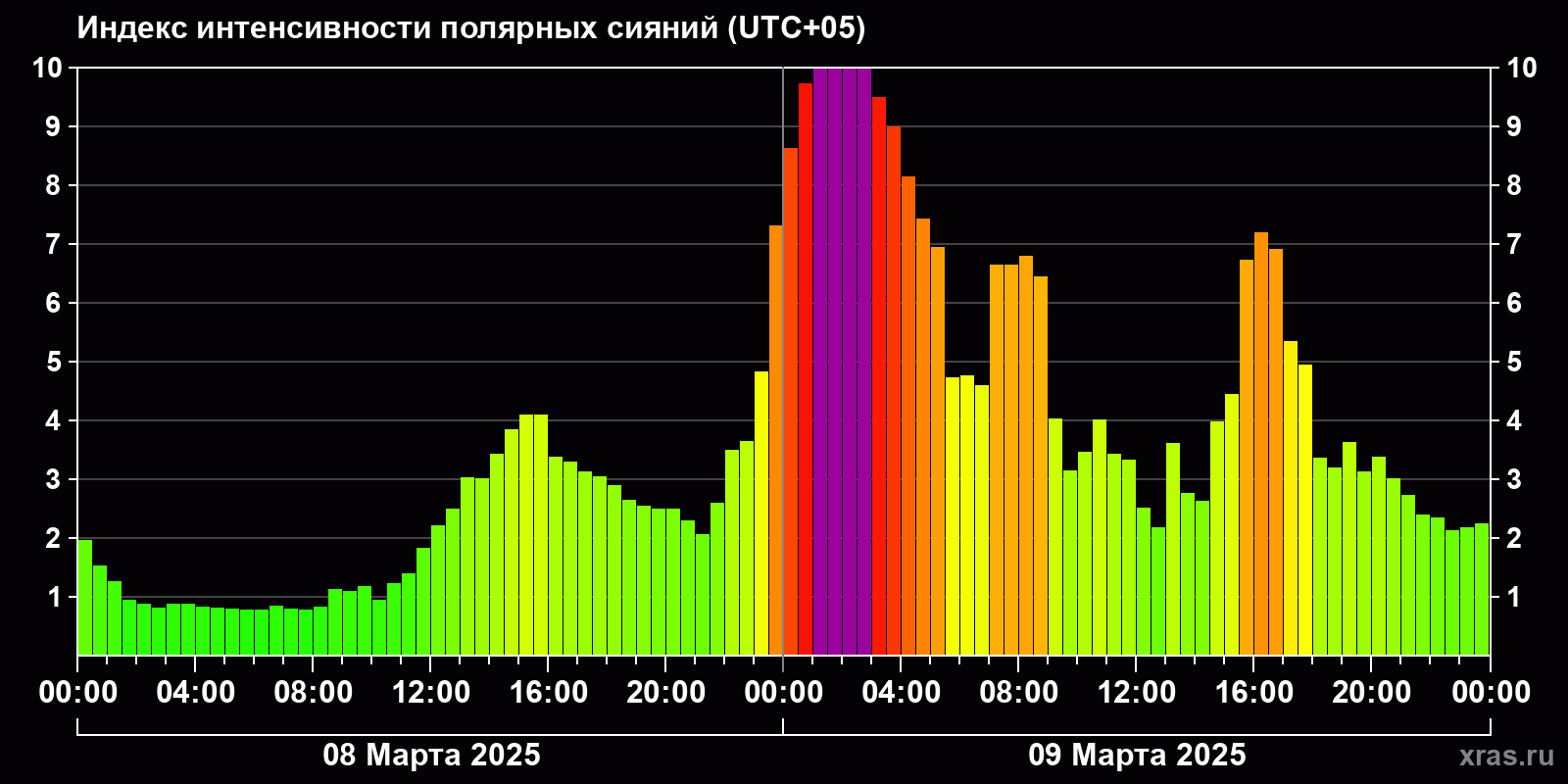 Изменения индекса интенсивности полярных сияний с 2025-03-08 по 2025-03-09 по местному времени