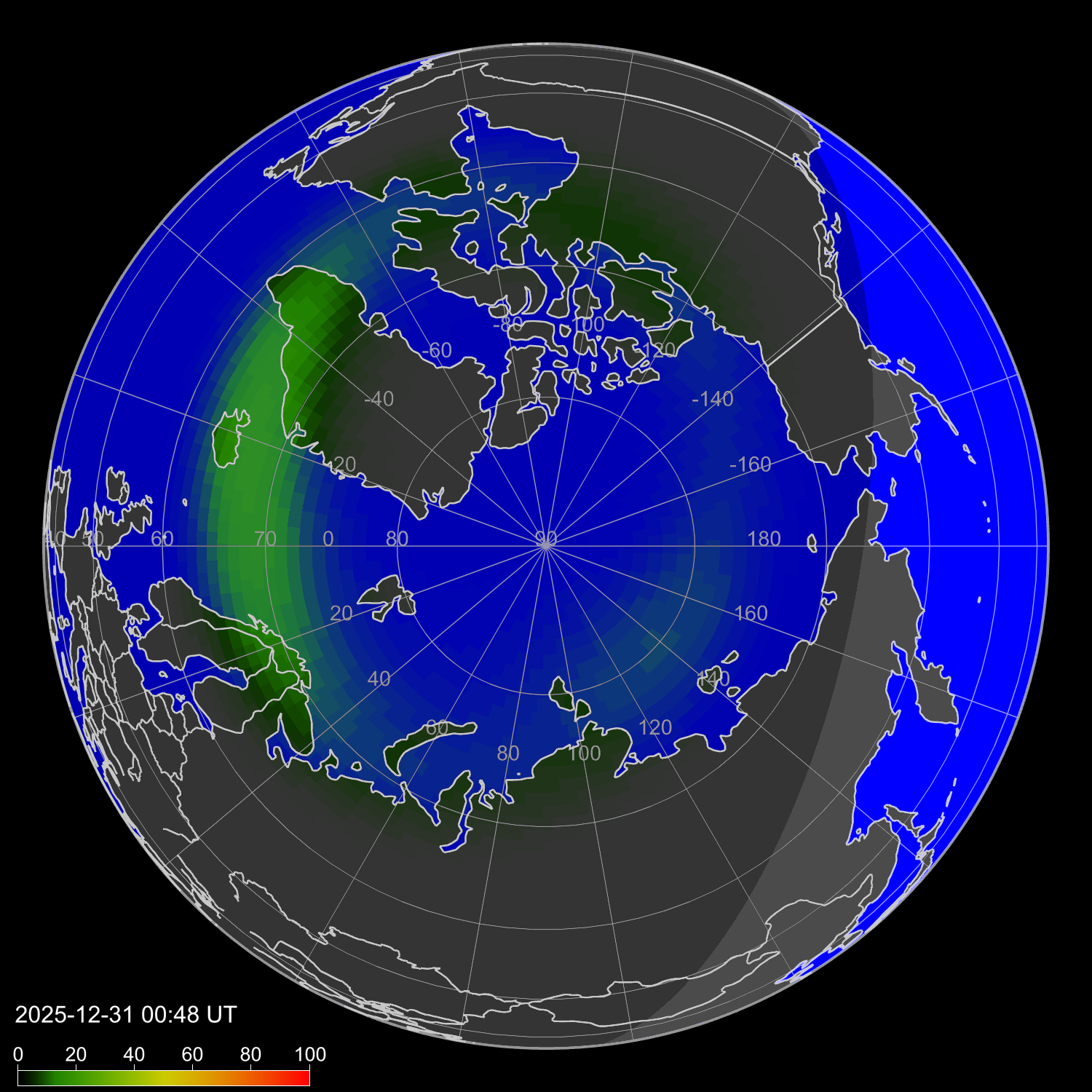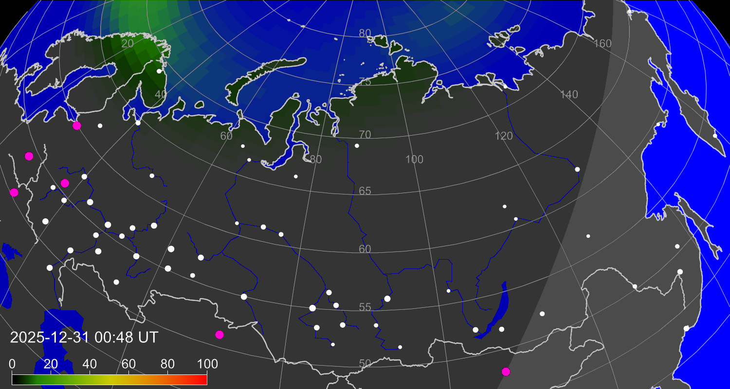 Изменения и часовой прогноз индекса интенсивности полярных сияний с 2025-12-31 по 2026-01-01