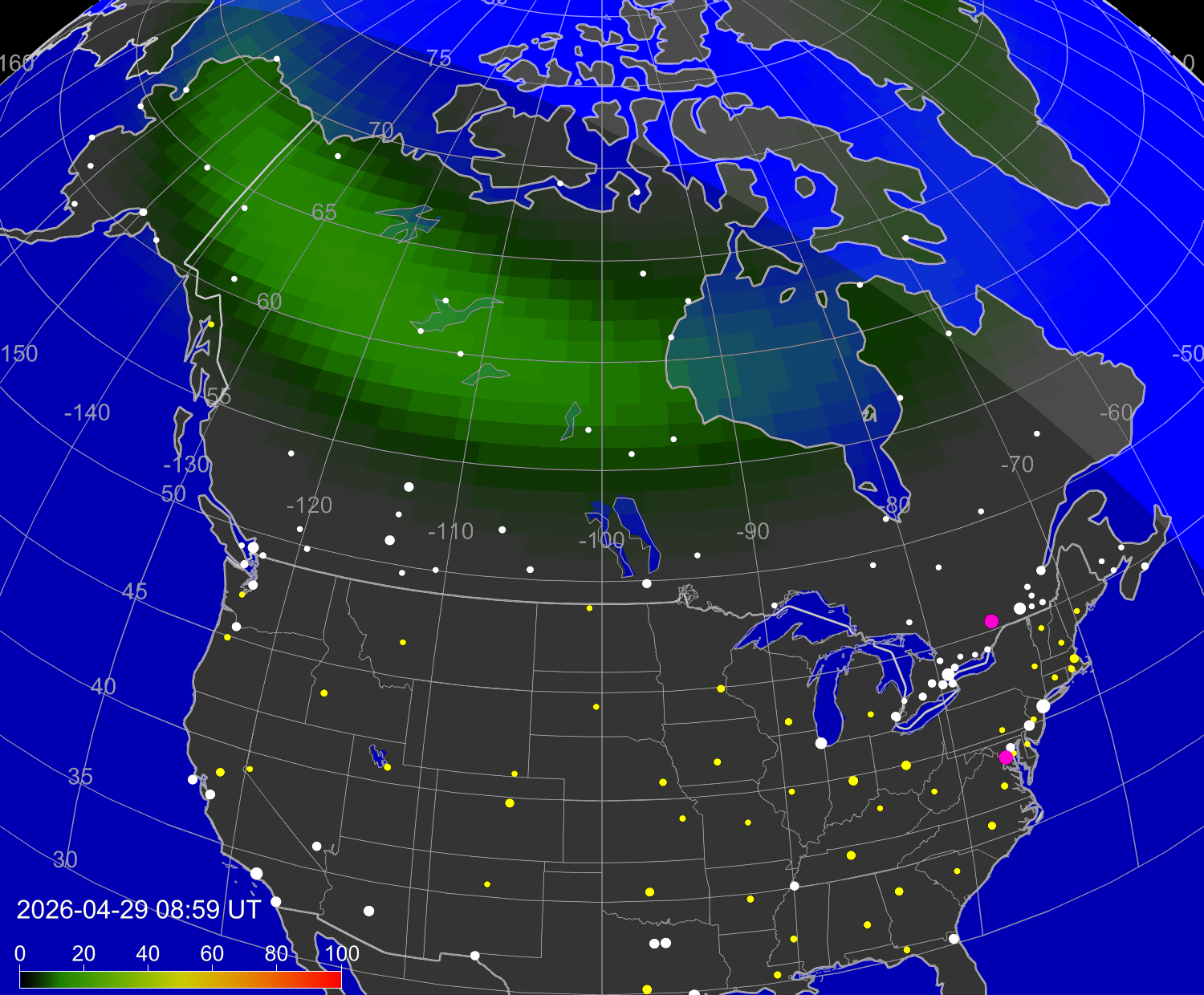 Индекс интенсивности полярных сияний и теоретически возможная широта наблюдений для ночного времени в западном полушарии
