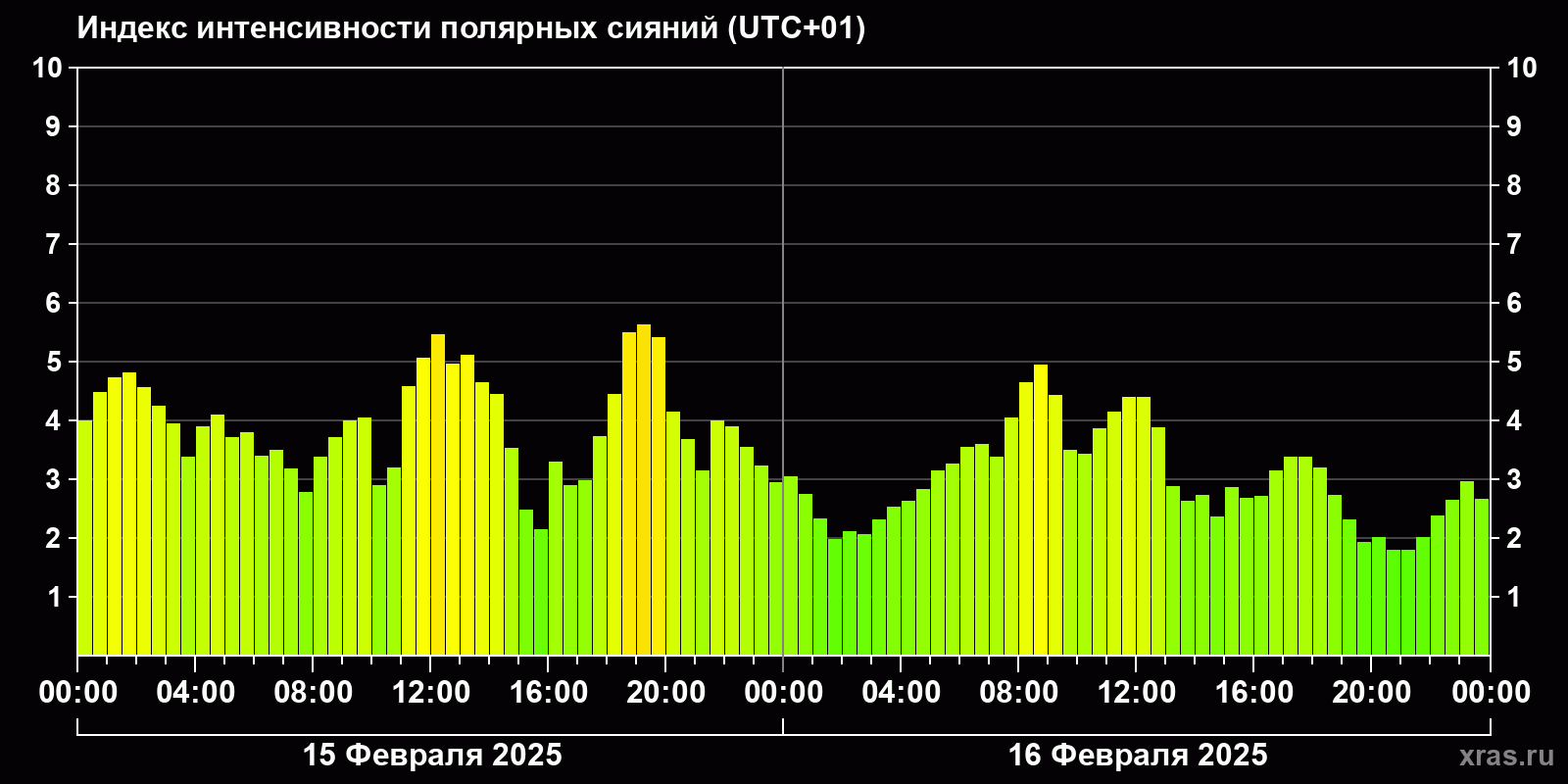 Изменения индекса интенсивности полярных сияний с 2025-02-15 по 2025-02-16 по местному времени