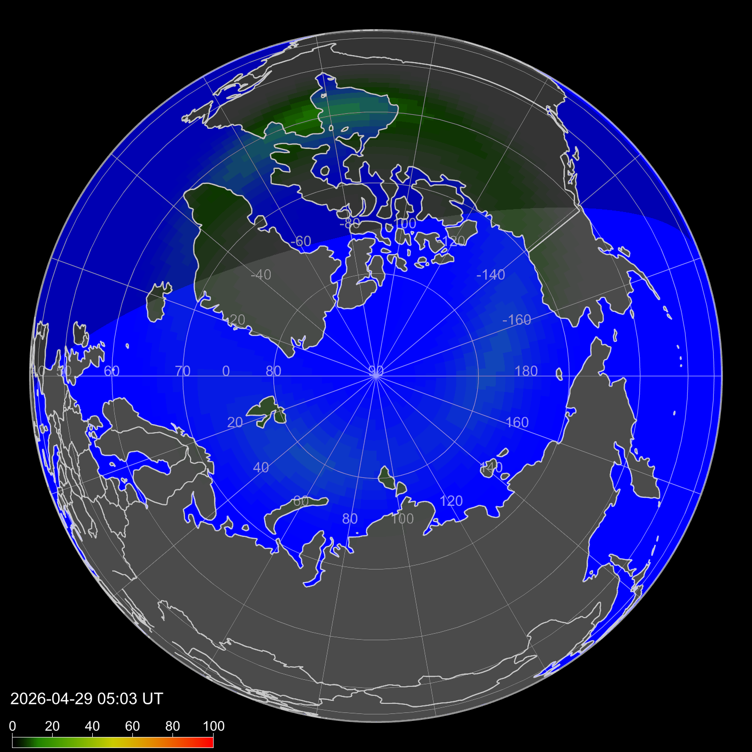 Индекс интенсивности полярных сияний и теоретически возможная широта наблюдений для ночного времени в восточном полушарии