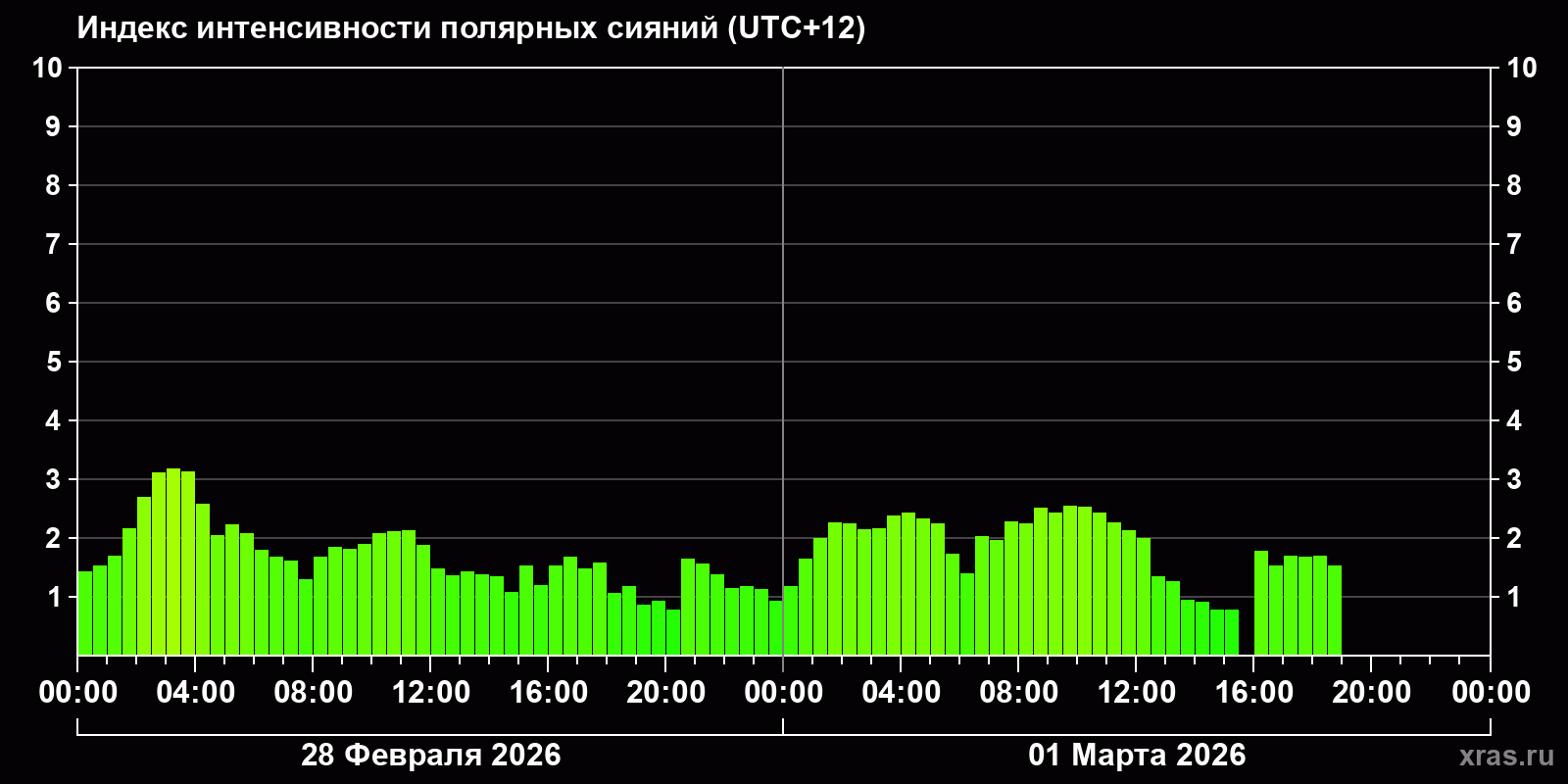 Изменения индекса интенсивности полярных сияний с 2026-02-28 по 2026-03-01 по местному времени