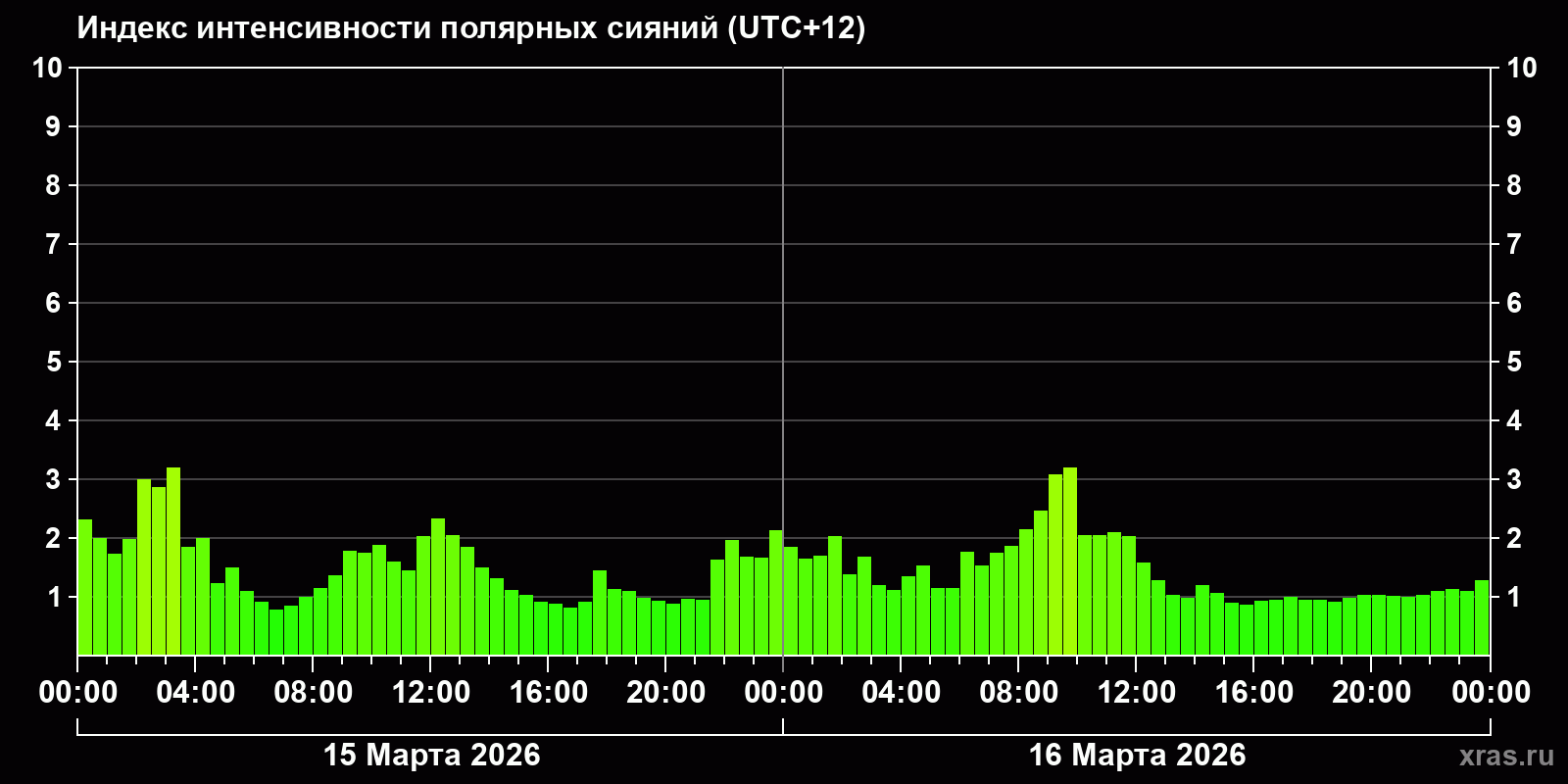 Изменения индекса интенсивности полярных сияний с 2026-03-15 по 2026-03-16 по местному времени